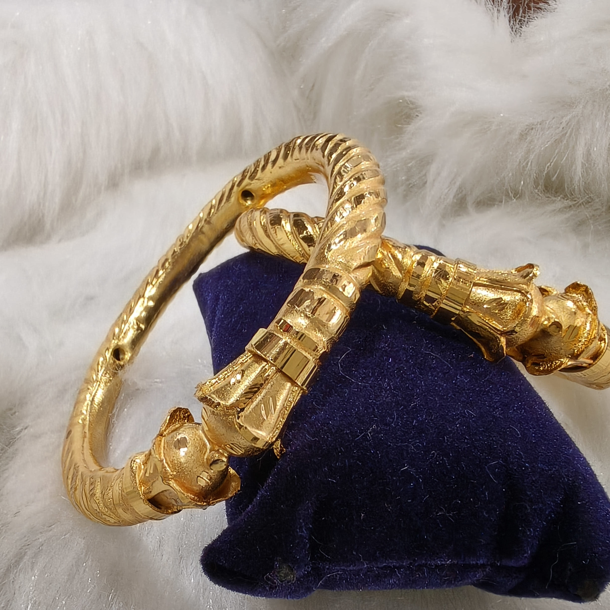 Indulge in the opulence of our Gold Plated Pair Farfo Bala with Mukh. Ideal for weddings, special occasions, and traditional festive wear, these golden-hued bangles radiate timeless elegance. The intricate mukh (face) design adds a touch of traditional charm, a celebration of artistry and culture. Expertly gold plated, they exude a lustrous finish, showcasing craftsmanship at its best. A valuable addition to our Traditional Collection, they flawlessly complement sarees and kurtis, enhancing your attire with a regal aura. Embrace the richness of tradition and grace your wrists with these exquisite bangles, epitomizing heritage and style.