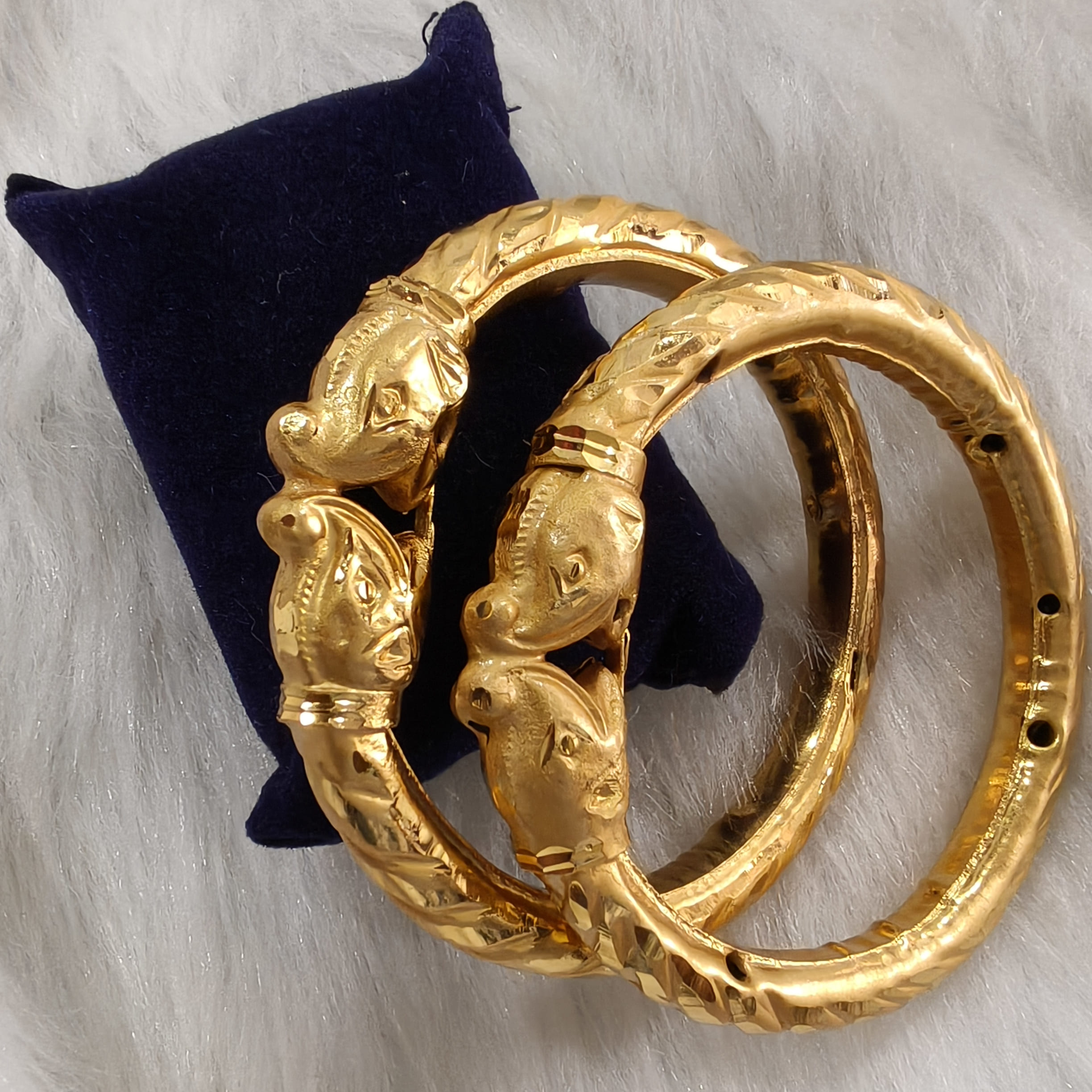 Indulge in the opulence of our Gold Plated Pair Farfo Bala with Mukh. Ideal for weddings, special occasions, and traditional festive wear, these golden-hued bangles radiate timeless elegance. The intricate mukh (face) design adds a touch of traditional charm, a celebration of artistry and culture. Expertly gold plated, they exude a lustrous finish, showcasing craftsmanship at its best. A valuable addition to our Traditional Collection, they flawlessly complement sarees and kurtis, enhancing your attire with a regal aura. Embrace the richness of tradition and grace your wrists with these exquisite bangles, epitomizing heritage and style.