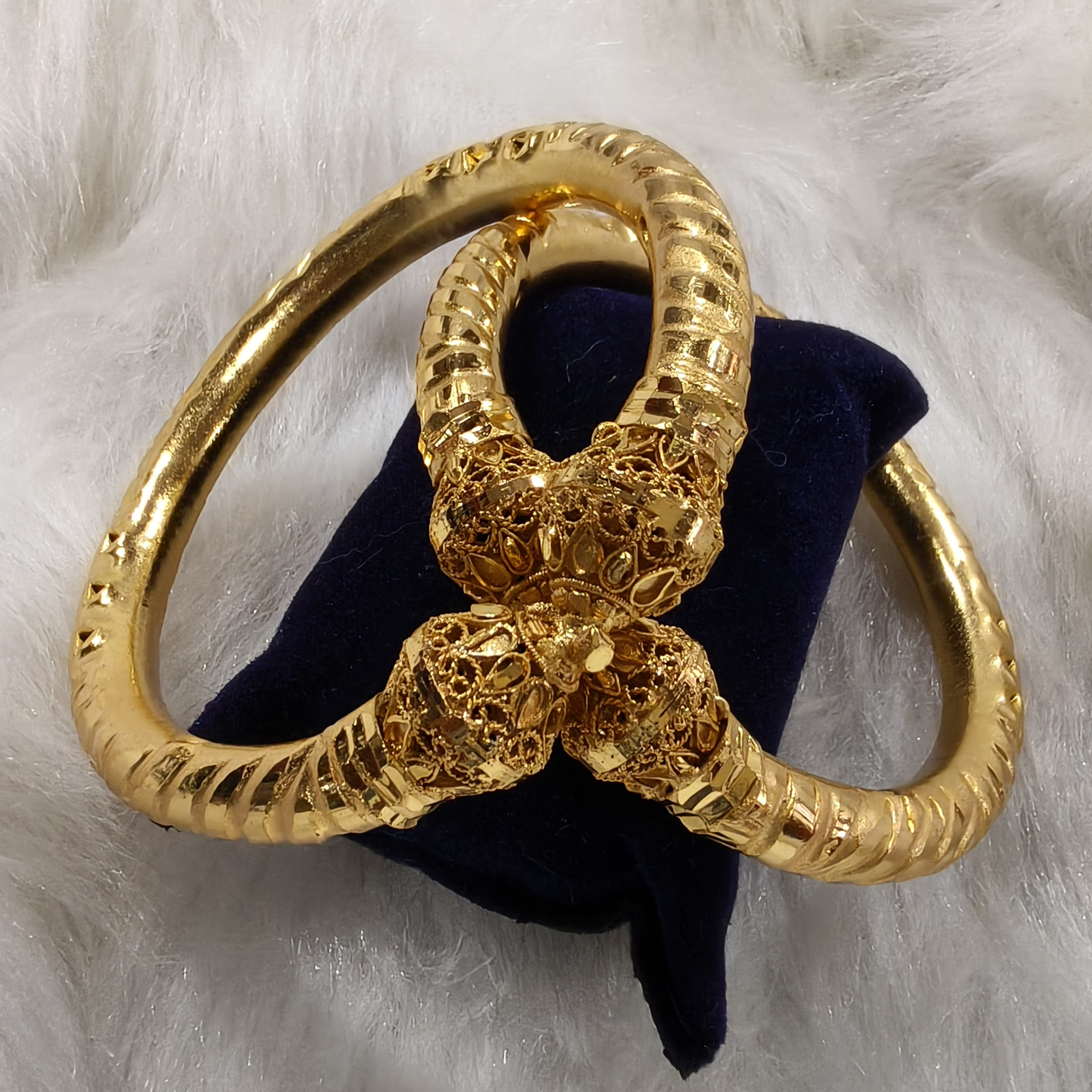 Indulge in the opulence of our Gold Plated Pair Farfo Bala with Mukh. Ideal for weddings, special occasions, and traditional festive wear, these golden-hued bangles radiate timeless elegance. The intricate mukh (face) design adds a touch of traditional charm, a celebration of artistry and culture. Expertly gold plated, they exude a lustrous finish, showcasing craftsmanship at its best. A valuable addition to our Traditional Collection, they flawlessly complement sarees and kurtis, enhancing your attire with a regal aura. Embrace the richness of tradition and grace your wrists with these exquisite bangles, epitomizing heritage and style.