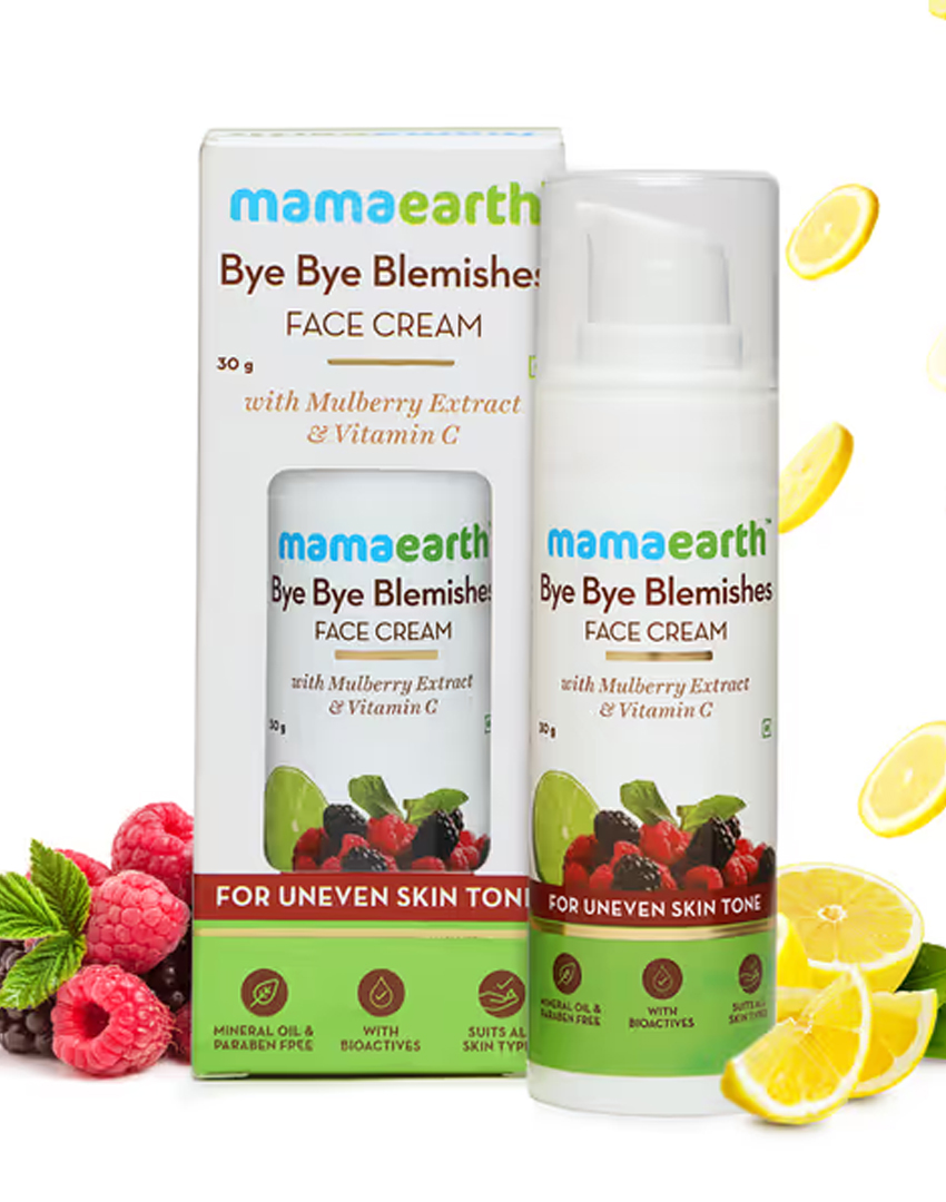 Mamaearth Bye Bye Blemishes* Face Cream is an effective cream enriched with Mulberry Extract, Daisy Flower Extract, and Vitamin C. Its unique and natural formulation prevents melanin synthesis and gives you soft and glowing skin. It reduces pigmentation and blemishes by restricting melanin deposits that appear as dark spots, patches, and hyper-pigmentation, thereby offering an even skin tone.