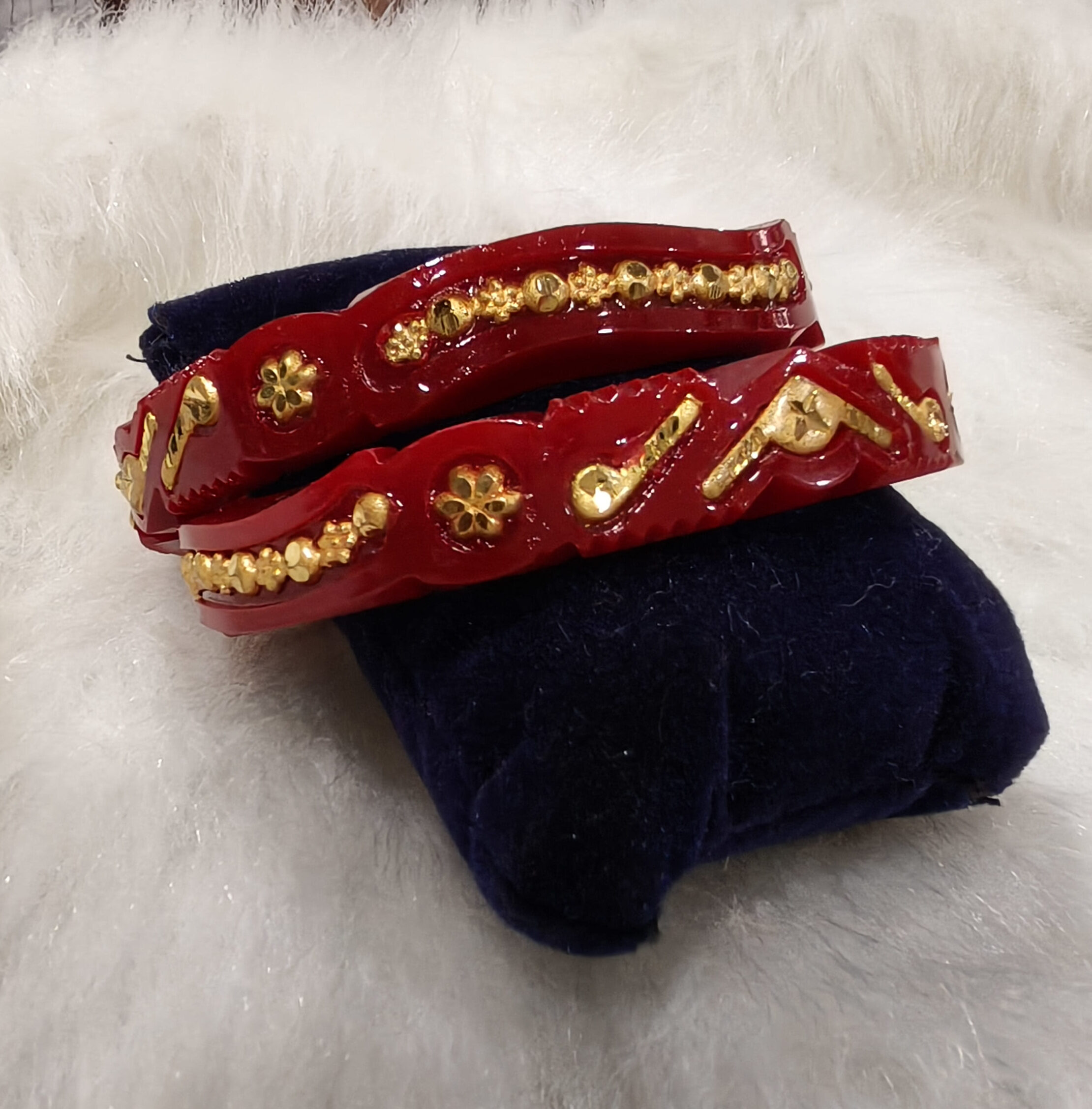 Introducing this beautiful pair of “Pola Badhano” bangles from our collection of traditional jewellery. We have added gold-plated designs to make it look more luxurious and elegant. If you are a Bengali Bride, then select this pair of bangles over any simple bangle to amp up your look. You can pair these round “Pola” bangles with traditional attire like a saree. These bangles are lightweight because we have used fibre as the base material, which you can wear for a long time. Get ready to receive a lot of compliments on your special day.